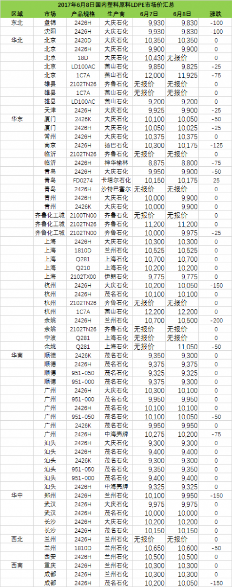 慧聰塑料網訊:今日午前PE市場走軟,華北和華東部分線性跌50-100元/噸,其余各大區的部分高壓和低壓跌50-100元/噸。線性期貨低開震蕩上揚,部分石化繼續降價,現貨市場跌勢難止,商家繼續跟跌。終端詢盤一般,剛需采購為主。華北地區LLDPE價格在8900-9100元/噸,華東地區LLDPE價格在9100-9500元/噸,華南地區LLDPE價格在9300-9500元/噸。