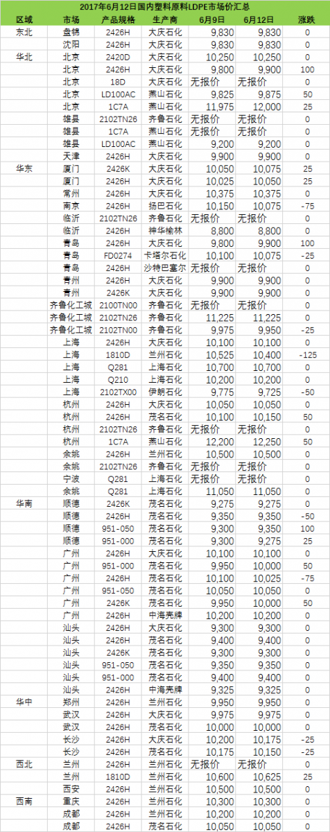 慧聰塑料網訊:今日午前PE市場部分小漲,各大區部分線性小漲50-100元/噸,個別低壓略高50元/噸,華東和華南部分高壓略高50元/噸。線性期貨高開上揚,且部分石化上調線性價格,市場得到支撐,商家小幅跟漲出貨。終端詢盤尚可,成交側重商談。華北地區LLDPE價格在9000-9100元/噸,華東地區LLDPE價格在9150-9500元/噸,華南地區LLDPE價格在9250-9500元/噸。